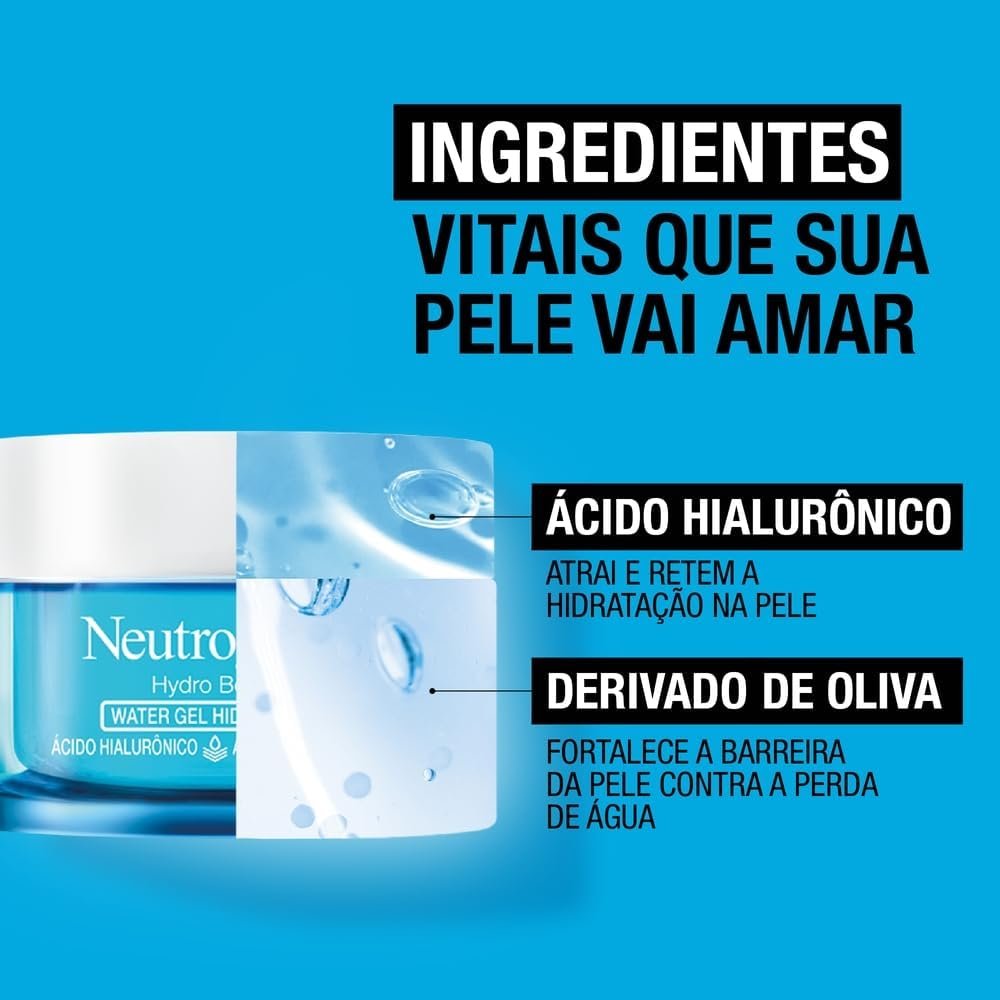 O que é e para que serve? Um hidratante facial com Ácido Hialurônico que restabelece os níveis de água da pele ao longo do dia, estimula sua renovação, fortalecendo a barreira de proteção natural contra o ressecamento. Com exclusiva textura ultraleve gel de rápida absorção, hidrata por 48 horas controlando e reduzindo a oleosidade. Benefícios e diferenciais -48h de hidratação: preenche instantaneamente a pele com 2 vezes mais hidratação -Com ácido hialurônico: restabelece os níveis de água na pele e estimula sua renovação, fortalecendo a barreira natural da pele -Textura ultra leve water gel: controle da oleosidade -Dermatologicamente testado e não comedogênico: não obstrui poros -Ideal para todos os tipos de pele, inclusive peles oleosas Como usar Com a pele limpa, aplique o produto sobre o rosto e pescoço e espalhe suavemente até a absorção completa. Pode ser usado diariamente, pela manhã e/ou à noite. Para uma rotina de hidratação completa, combine com o Sérum Hidratante NEUTROGENA® Hydro Boost. Composição -Ácido Hialurônico: Protege a barreira cutânea contra a perda de água, mantendo uma hidratação intensa e prolongada. Lista completa de ingredientes: Aqua, Dimethicone, Glycerin, Domethicone/Vinyl Domethicone Crosspolymer, Phenoxyethanol, Polyacrylamide, Cetearyl Olivate, Dimethiconol, Sorbitan Olivate, C13-14 Isoparaffin, Dimethicone Crosspolymer, Chlorphenesin, Carbomer, Sodium Hyaluronate, Laureth-7, Ethylhexylglycerin, Parfum, C12-14 Pareth-12, Sodium Hydroxide, CI 42090. Precauções Somente para uso externo. Não ingerir. Evite contato direto com os olhos. Caso isso aconteça enxaguar abundantemente. Se ocorrer irritação ou desconforto, descontinue o uso e consulte um médico. Conservar fora do alcance das crianças, em local fresco e seco. USO ADULTO.
